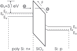 Электроны в канале получают высокое дрейфовое ускорение, и при напряженности электрического поля выше ~100 kV/cm их кинетическая энергия не успевает рассеяться на атомах кристаллической решетки, что приводит к их «разогреву». В результате большее число электронов становится способным преодолеть потенциальный барьер диэлектрика (рис. 2), и, при наличии «инжектирующего» электрического поля (положительный потенциал приложен к управляющему затвору) — накапливаться на плавающем затворе ячейки.