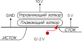 В результате в области истока образуется «канал», по которому происходит стекание заряда с плавающего затвора за счет туннельного перехода через потенциальный барьер (рис. 4).