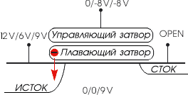 Туннелирование Фаулера-Нордхейма — переход электронов в плавающий затвор при смещении потенциального барьера электрическим полем. Поле возникает при приложении разницы потенциалов между управляющим затвором (-) и истоком (+) (рис.3).