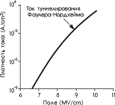 Как видно из приведенных схем, токи заряда и разряда плавающего затвора ячейки сконцентрированы в локальной области изолирующего затвор диэлектрика. Зависимость плотности тока от напряженности поля показана на рис. 5.