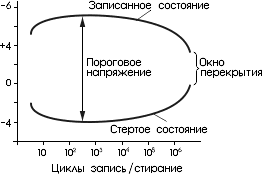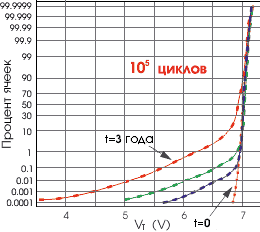 Схематическая зависимость времени сохранения заряда от числа циклов записи-стирания ячеек матрицы показана на рис. 6, а порогового напряжения ячейки — на рис. 7.