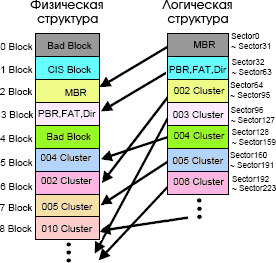 В распространенных накопителях (USB Flash drives, картах памяти стандартов CF, SD и др.) данная функция выполняется встроенным программным обеспечением (firmware) контроллера накопителя, в картах памяти стандартов SmartMedia, xD — возлагается на ПО устройства, в котором эта карта применяется. В общем случае трансляция производится путем выборки адресов физических блоков по хранимым на той же микросхеме таблицам соответствия (рис. 8).